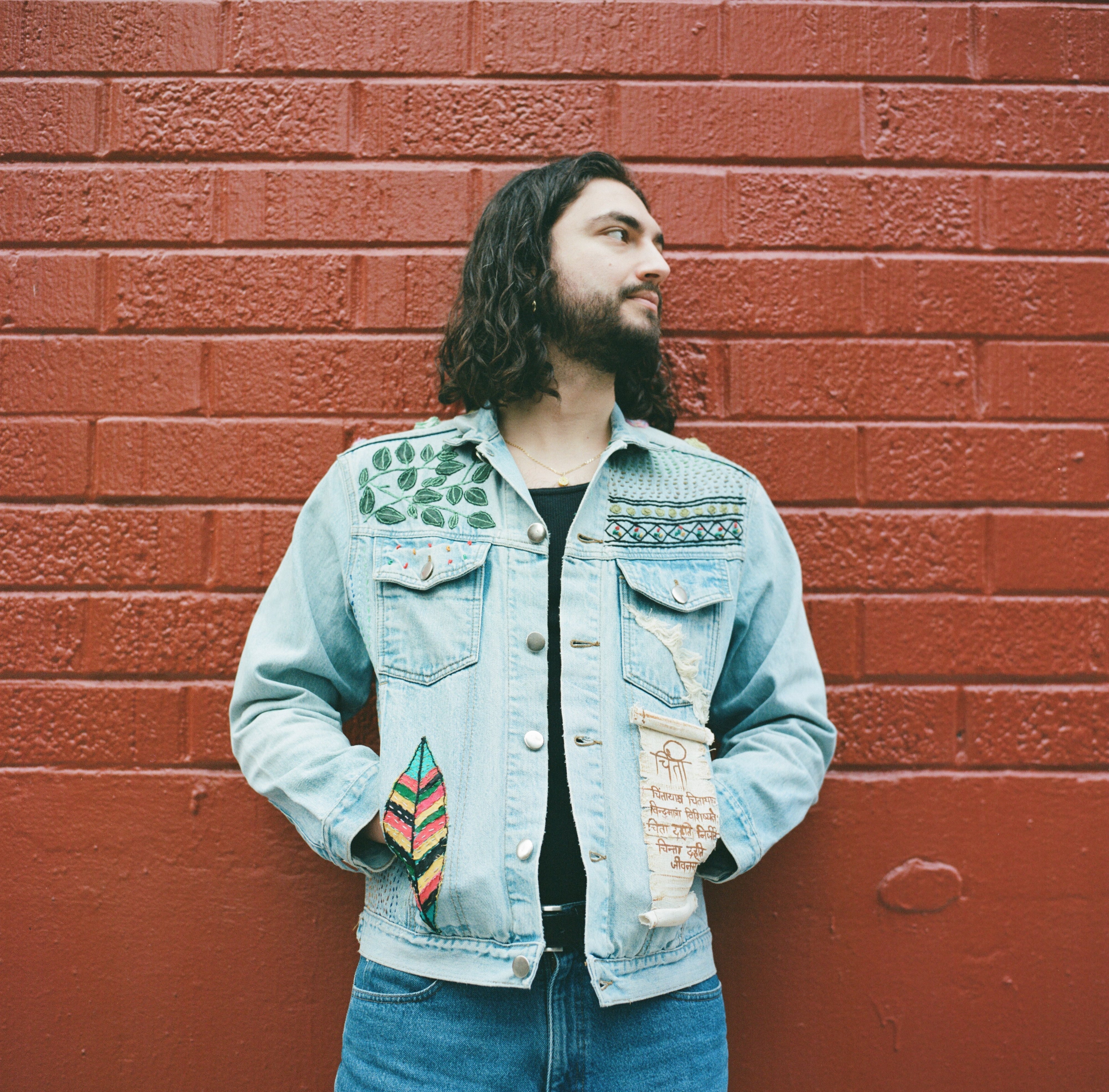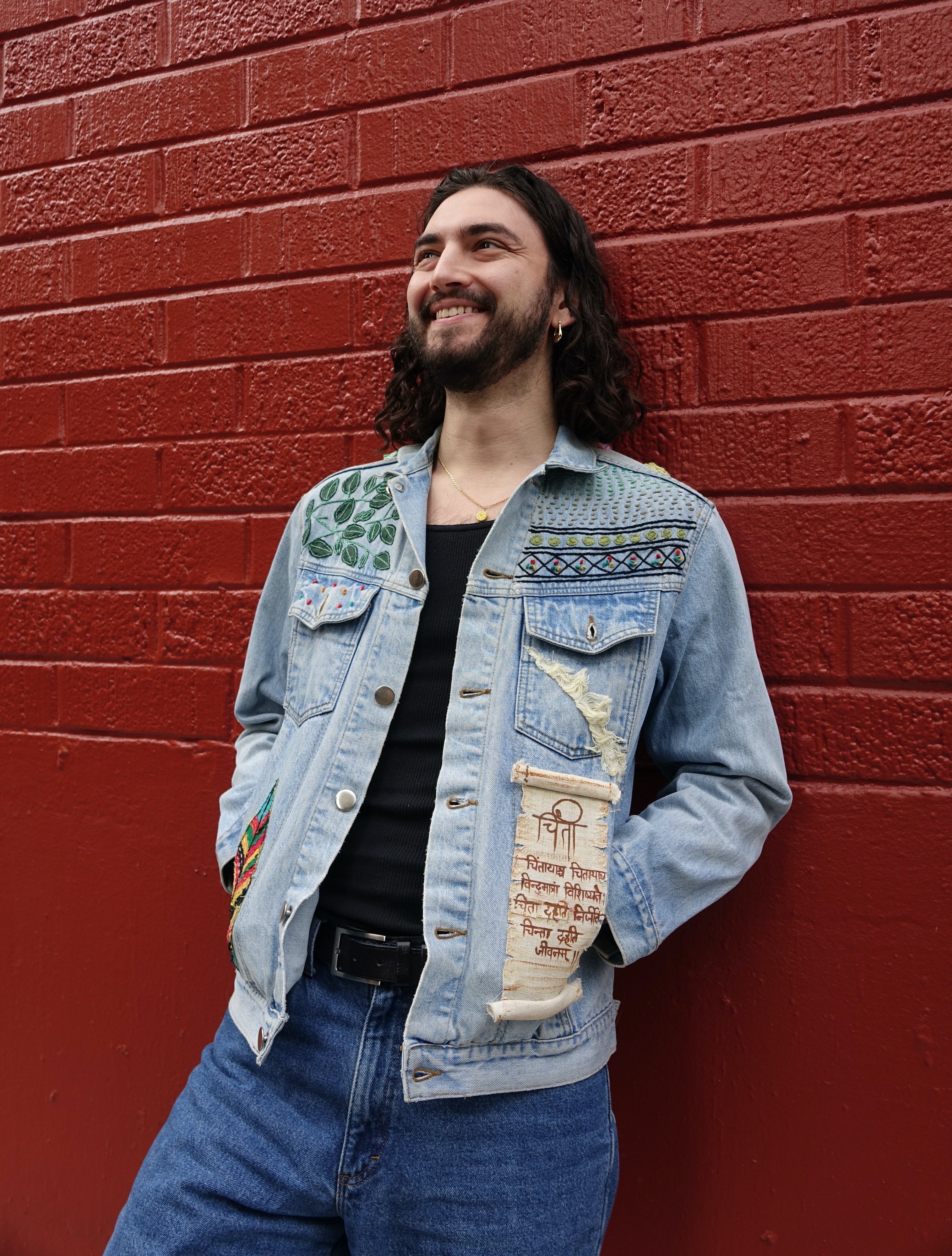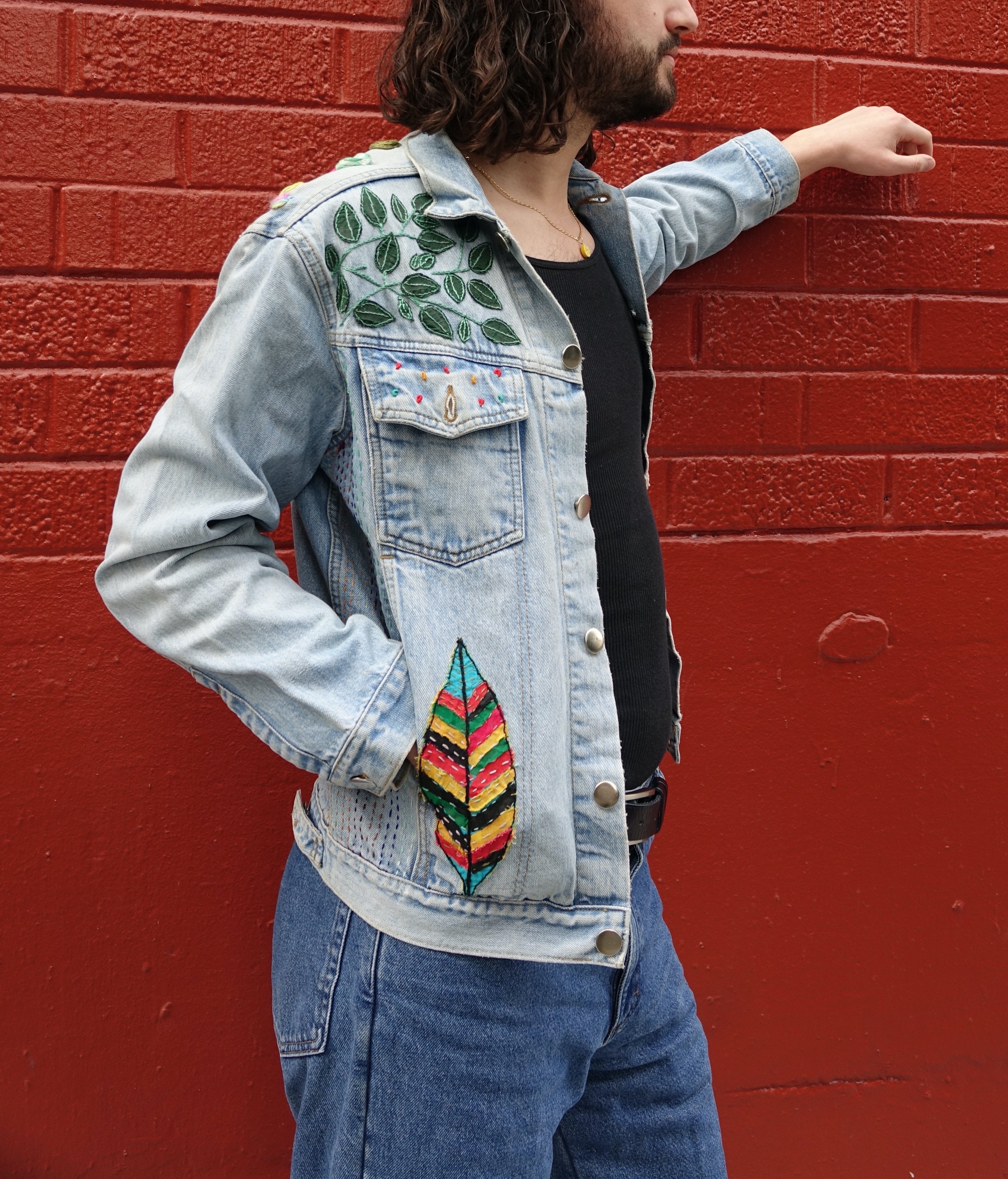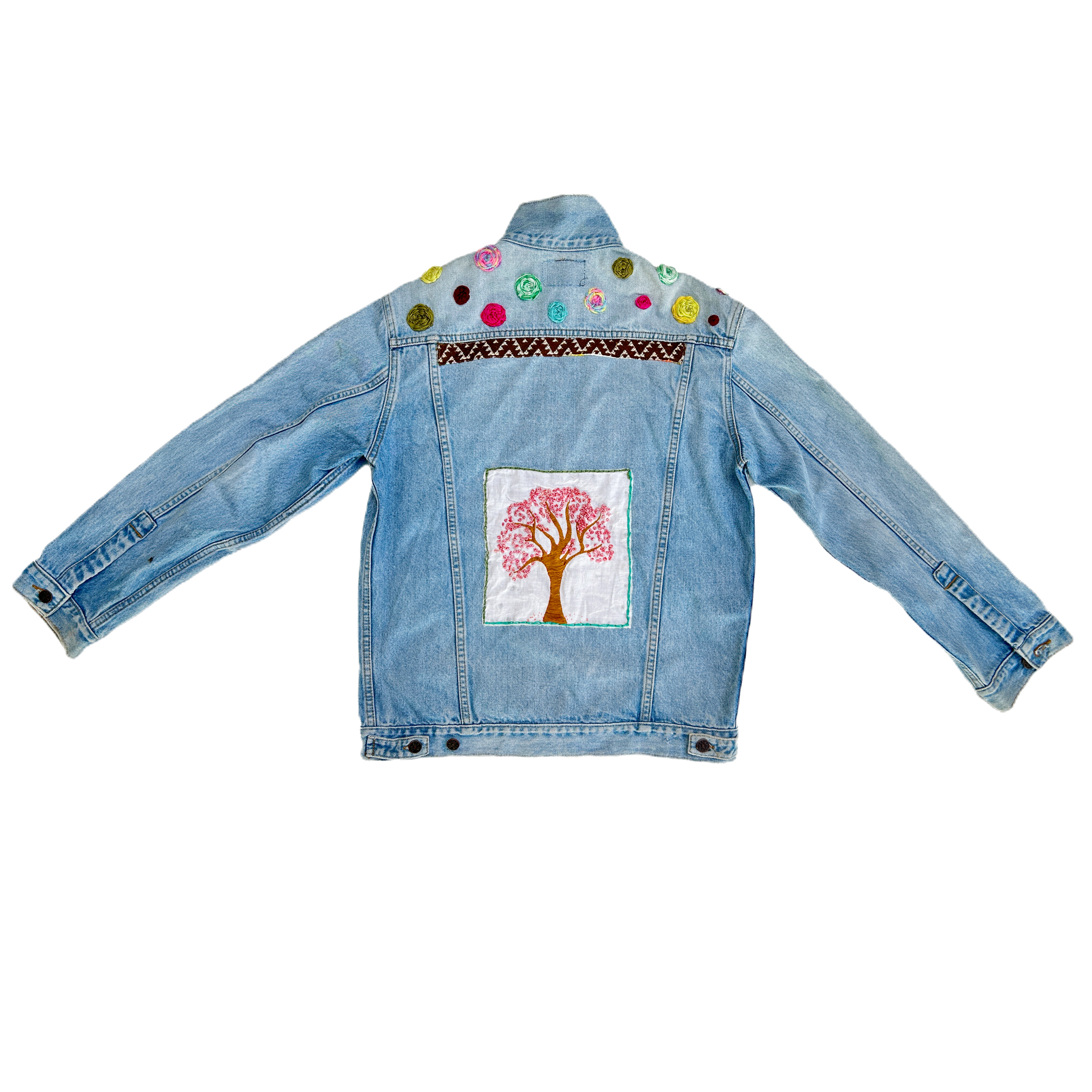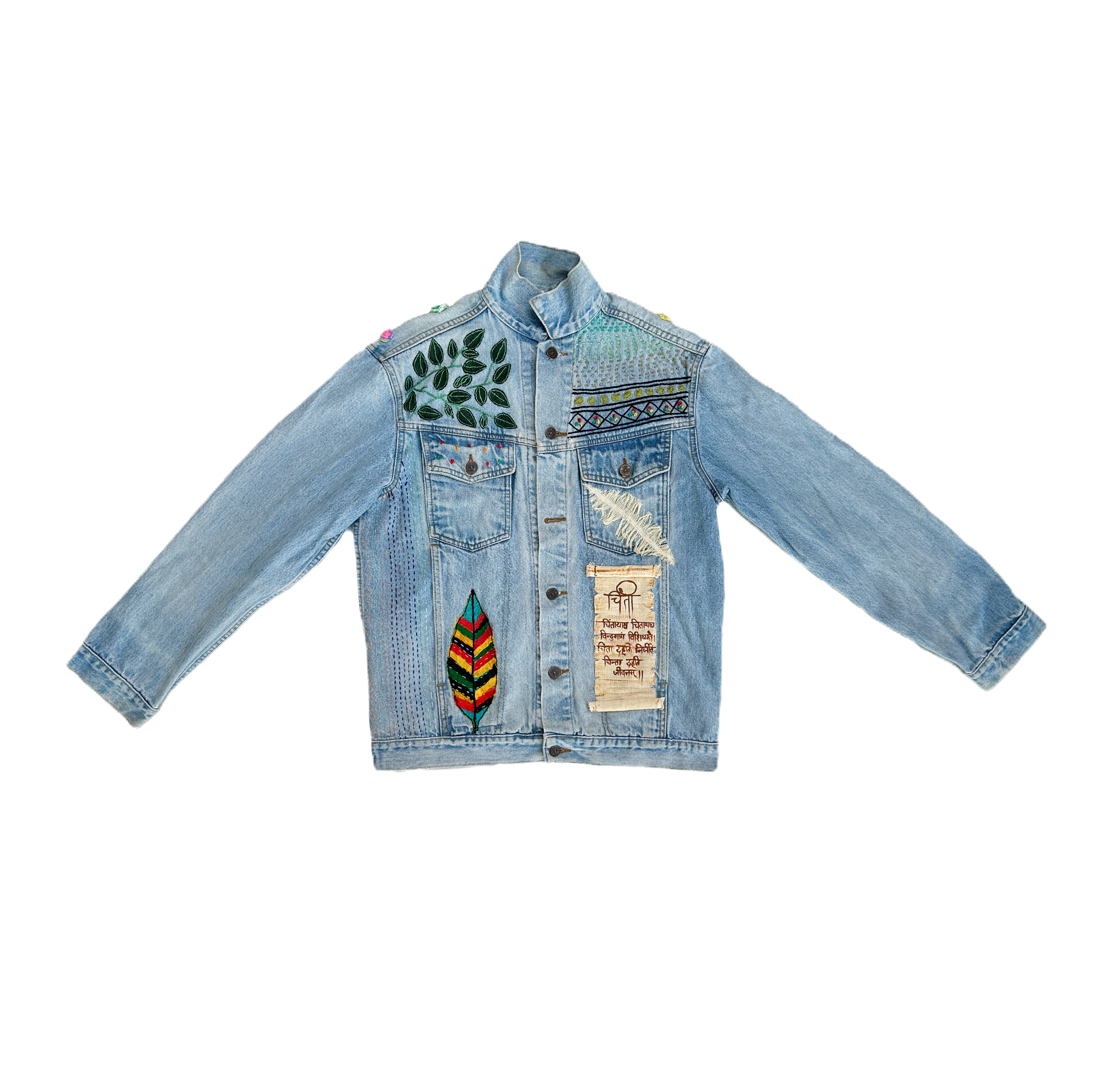 This handcrafted, artisan upcycled denim jacket embodies a harmonious blend of sustainability and artistry. The front of the jacket features an intricately hand sewn scroll which has a message written in Sanskrit. The jacket is elegantly adorned with delicate green leaves that seem to breathe life into the fabric. The back of the jacket is a canvas for a magnificent cherry blossom tree. The tree is in full bloom, with pink blossoms that are so lifelike, they appear to flutter in an unseen breeze. This unique piece not only exemplifies eco-friendly fashion but also serves as a wearable piece of art, highlighting the beauty of nature.
